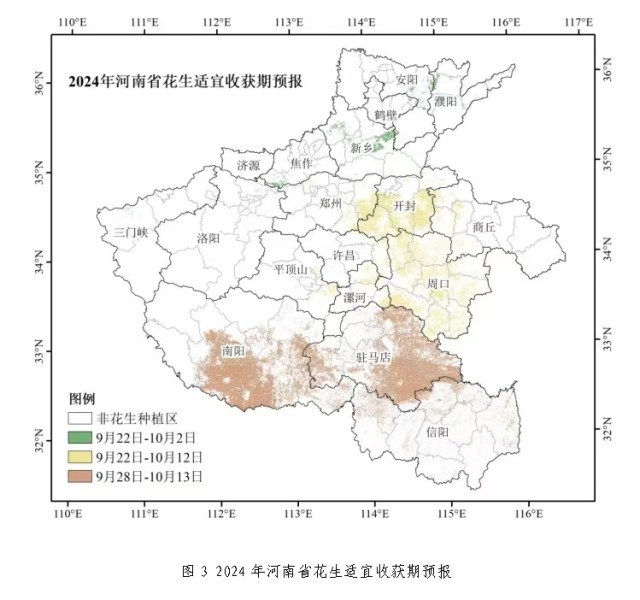 预计2024年花生适宜收获期在9月22日~10月13日,全省大部地区花生适宜收获期较常年略偏晚。安阳、濮阳、鹤壁、新乡、焦作、济源、三门峡和洛阳地区麦套花生适宜收获期为9月22日~10月2日;郑州、开封、商丘、许昌、平顶山、漯河和周口地区麦套花生和夏直播花生适宜收获期为9月22日~10月12日;南阳、驻马店和信阳为9月28日~10月13日。