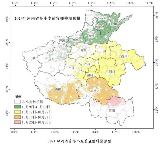 根据我省秋作物发育进程及冬小麦常年播种期,结合未来天气趋势预测结果,预计今年我省冬小麦适宜播种期较常年略偏晚。豫北和豫西大部为10月9日~19日,局部丘陵山区可适当提前;豫中和豫东大部为10月12日~22日;南阳、驻马店地区为10月17日~27日,信阳稻茬麦区为10月20日~30日。