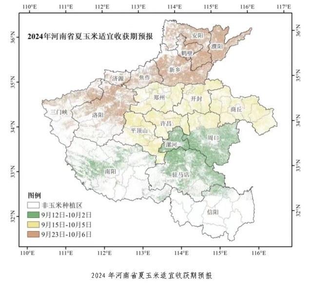 根据当前夏玉米发育进程及未来天气条件,预计2024年夏玉米适宜收获期在9月12日~10月6日,较常年提前3天左右。南阳、信阳、驻马店、漯河和周口南部地区适宜收获期为9月12日~10月2日;郑州、开封、商丘、平顶山、许昌和周口北部为9月15日~10月5日;豫西和豫北地区为9月23日~10月6日。
