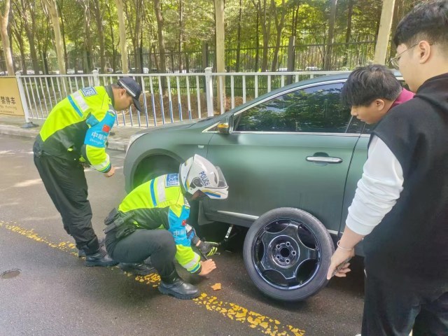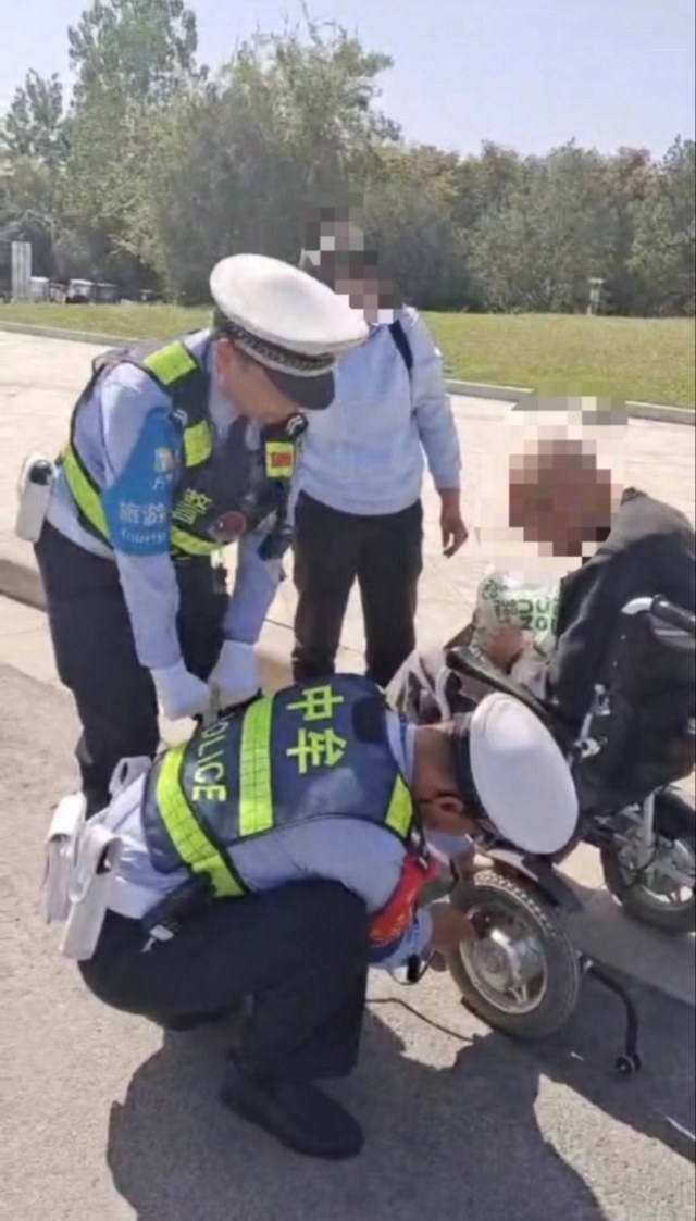 执勤期间,中牟交警多次帮助车主给汽车换胎,并为漏气轮椅打气,让前来游玩的市民感受到温暖与关怀。