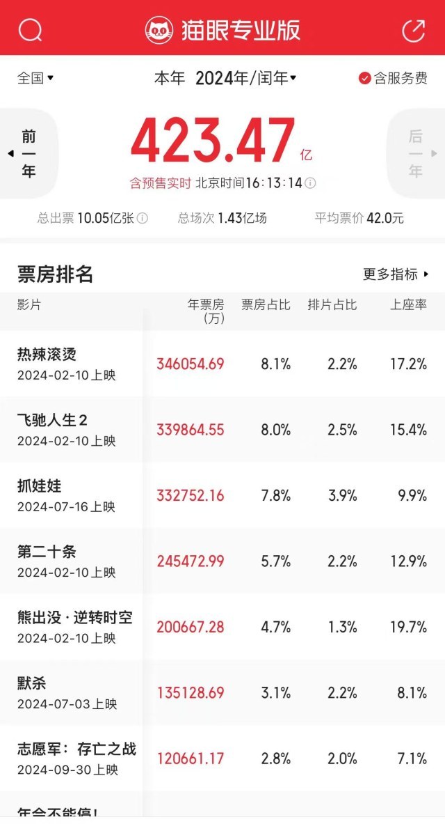 数据显示,截至目前,2024年总观影人次突破10亿,总票房超过423亿元。热门档期表现亮眼,春节档、元旦档、清明档均刷新中国影史票房纪录。在多位业内人士看来,2024年影片质量过硬,题材更加丰富多元,让人看到中国电影的内在韧性和巨大潜力。奥斯卡院线经营部副经理刘丽雪:“女性题材电影异军突起,《热辣滚烫》《出走的决心》《好东西》口碑票房都有不错的成绩,说明我们现在的观众观影需求多元化。”