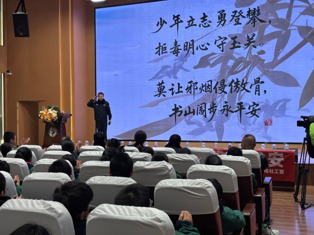 当天的禁毒课分为两个环节。室内讲座环节中禁毒民警通过PPT课件向学生们讲解毒品的种类、危害、防范技巧以及相关法律法规。同时,禁毒民警还结合真实的案例剖析毒品对个人、家庭和社会的危害,并以案说法来增强同学们的法治意识,对毒品坚决说“不”!课堂上民警穿插进行禁毒知识问答,引得学生们纷纷举手抢答,现场高潮迭起,答对问题的同学都获得了精美的禁毒小礼品,让禁毒课堂变得生动又活泼。