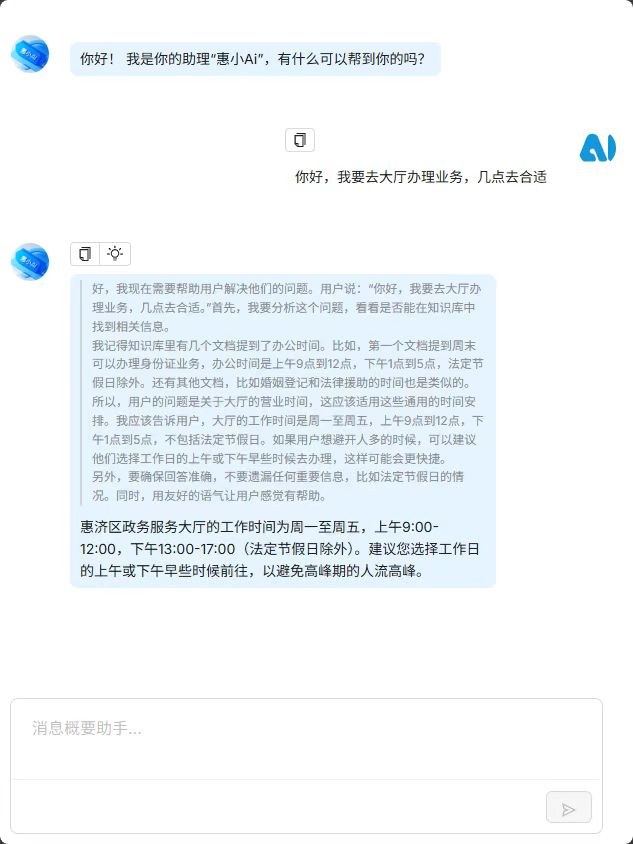 近日,惠济区行政审批和政务信息管理局推出的“惠小AI”政务服务助手正式上线试运行,依托AI技术实现200多项高频政务服务"秒问秒答",让群众办事更便捷、更高效。