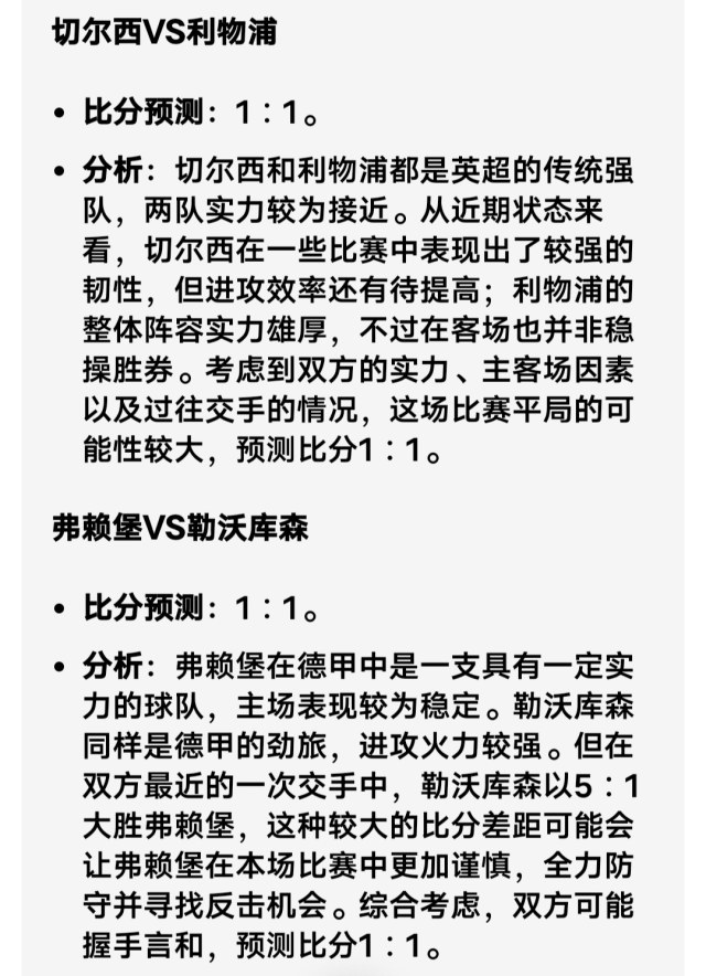 弗赖堡VS勒沃库森 deepseek预测 1-3 豆包预测 1-1