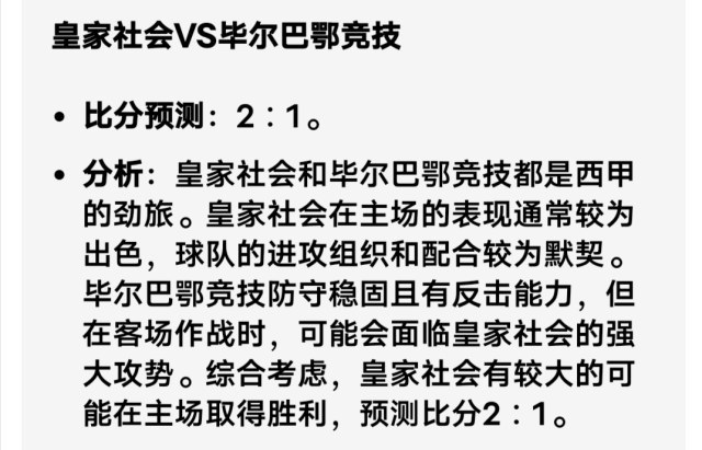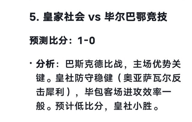 皇家社会VS毕尔巴鄂竞技 deepseek预测 1-0 豆包预测 2-1