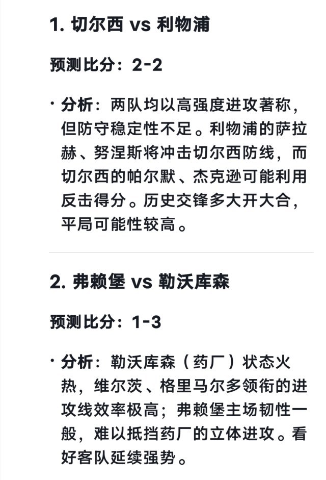 切尔西VS利物浦 deepseek预测 2-2 豆包预测 1-1