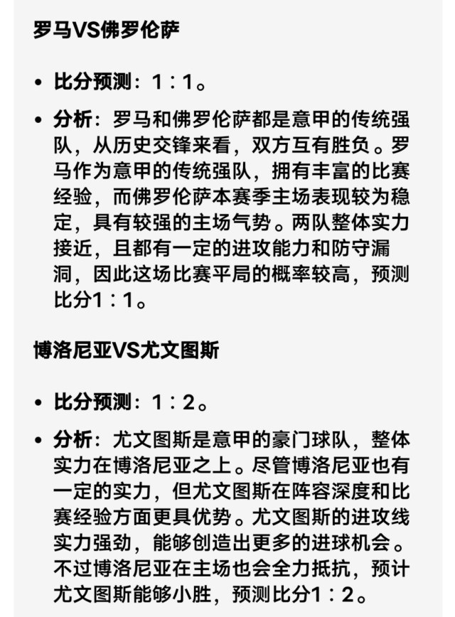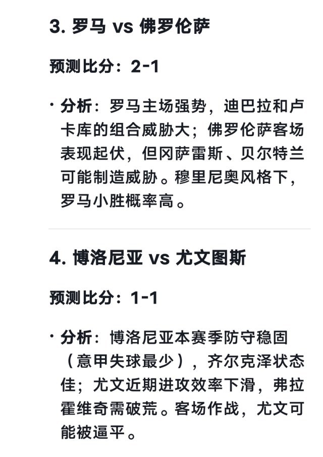 罗马VS佛罗伦萨 deepseek预测 2-1 豆包预测 1-1