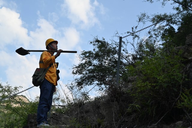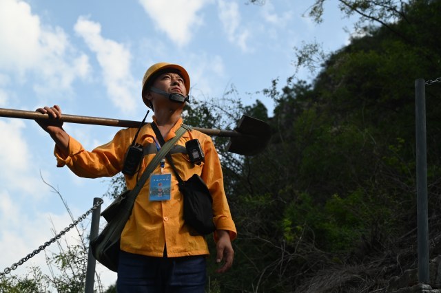 5月14日早上7时00分,危石看守工张晋辉扛上铁锹,背上装满防护备品的工具包,带着望远镜开始巡查山体和线路。