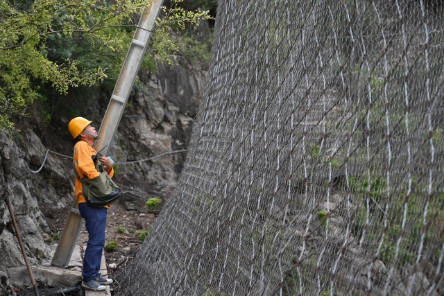 10分钟后,拐过3道弯,上衣湿透的张晋辉爬到了半山腰,仔细检查沿着山体向前延伸的防护网和山体上方有没有松动的岩石,在记录簿上记录着检查情况。在阳光的照射下,包裹在山体上的防护网银光闪闪。