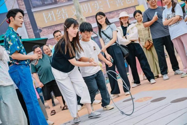 建业电影小镇打造“全龄段沉浸体验”,白日里,复古游乐场的丢沙包、滚铁环等80后游戏吸引亲子家庭互动,手工课堂的油纸伞制作与皮影戏展演成“寓教于乐”亮点;夜间,《一路有戏》实景演出带游客穿越百年郑州,激活夏日夜经济。其中,《回到小时候》全新节目被央视《新闻联播》聚焦报道。