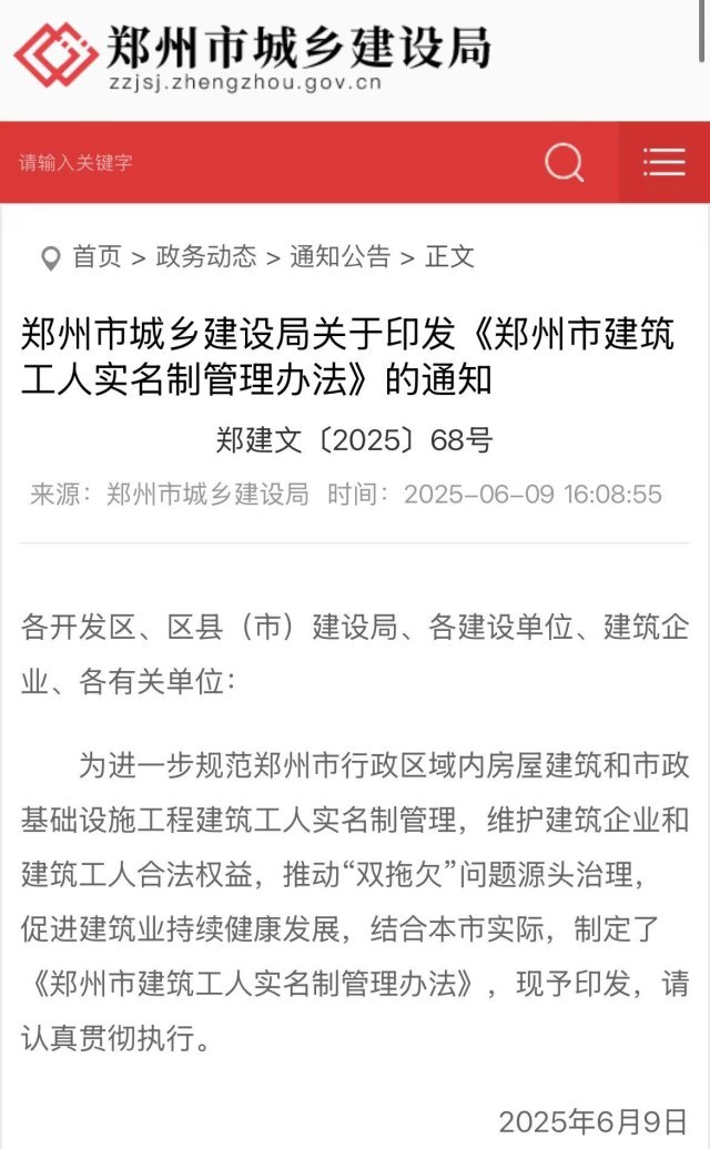 经过近5年的试行,《郑州市建筑工人实名制管理办法》自2025年6月9日起施行,建筑工人、项目工作人员等都被纳入实名制管理,来更好地维护其合法权益。