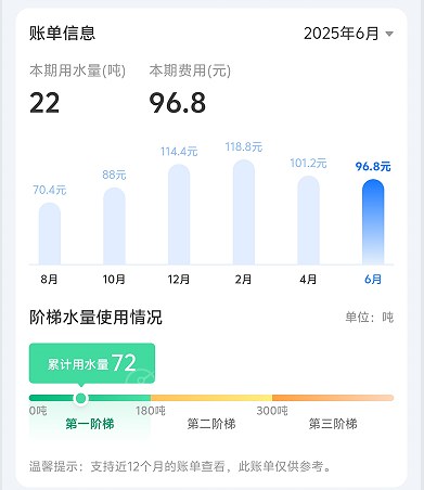 据介绍,在新开通的这三项服务功能中,账单信息可以清晰知道本期的水费金额和精确的月度用水量。同时,还支持近12个月历史账单查询和年度累计用水量查询。在接近第一阶梯水费用量时该系统还会及时发出提醒。服务通知功能分为出账提醒、缴费预警、停水通知。每月水费账单生成后,及时向用户推送缴费信息。若用户因忙碌疏忽缴费,系统将及时发送提醒信息,避免因欠费导致停水。如果有计划性停水,系统也会提前24小时告知。电子发票功能则让用户告别线下开具发票的繁琐与等待。用户通过支付宝就能轻松开具水费电子发票。同时,发票信息采用加密存储,并支持随时查询、下载。