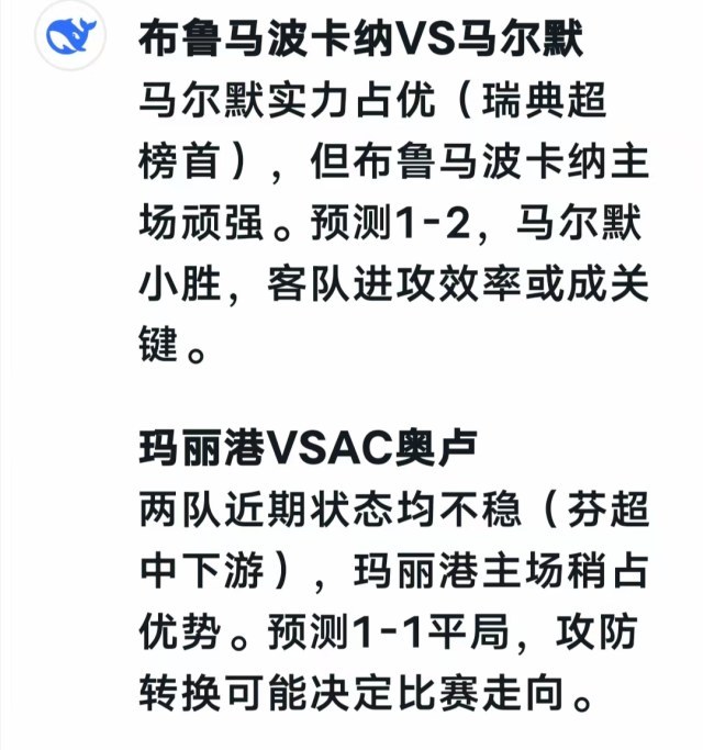 布鲁马波卡纳VS马尔默 deepseek 预测1-2 豆包预测0-2、1-3