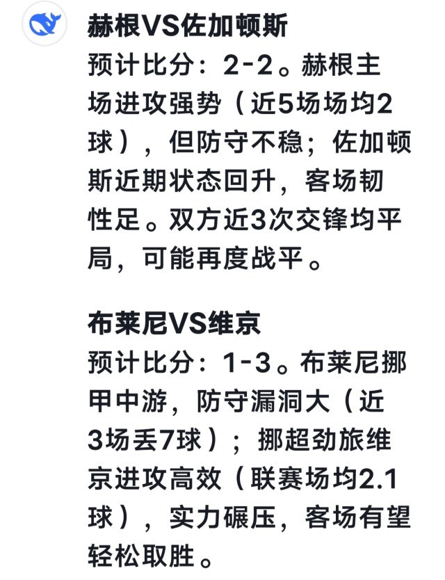赫根VS佐加顿斯 deepseek 预测2-2 豆包预测1-1