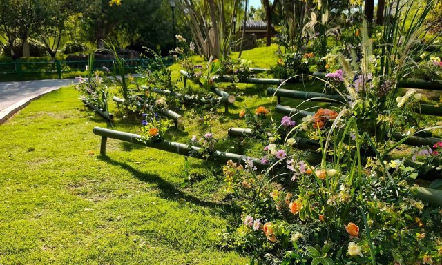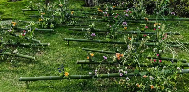 在花园路鑫苑路附近的雨园内,绿文广场中心创新思路,把插花艺术融入自然景观,依托雨园草坪的自然基底,巧借原生竹竿、狼尾草、扶芳藤等植物素材,搭配牡丹月季、绿色风铃、小雏菊、梭鱼草等时令鲜花,精心打造了一组错落有致的竹竿插花景观。青翠的竹竿撑起绿意,柔美的狼尾草随风轻摇,缠绕的扶芳藤点缀其间,鲜花的绚烂与草木的野趣相映成趣,为草坪注入自然雅致的园林韵味,让游客在纳凉时既能欣赏自然野趣,又能感受园艺巧思。