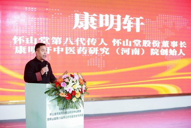 10月26日,“河南中医药大学怀山堂药食同源校企研发中心揭牌暨怀山堂第23届怀山药非遗文化节启动”活动在温县怀山堂总部举行。河南省政府参事、河南省老字号协会名誉会长赵志正,温县农业农村局副局长任小红,焦作市怀药行业协会会长郭铁军,河南省老字号协会副会长兼秘书长程振中,温县四大怀药秘书长王亚鹏,河南中医药大学第一附属医院儿童脑病诊疗康复中心副主任白青云教授、儿科脑病康复心理病区主任党伟利教授,怀山堂第九代传人、副董事长康静,河南中医药大学研发团队,中国质量报、凤凰网、中国食品安全网、央广网、河南日报、顶端新闻、网易新闻、正观新闻、河南广播(大象新闻)、河南交通广播、郑州音乐广播等媒体代表,以及200多名来自全国各地的非遗食养爱好者、怀山堂忠实消费者共同参与此次盛会。怀山堂第八代传承人康明轩出席并致欢迎辞。