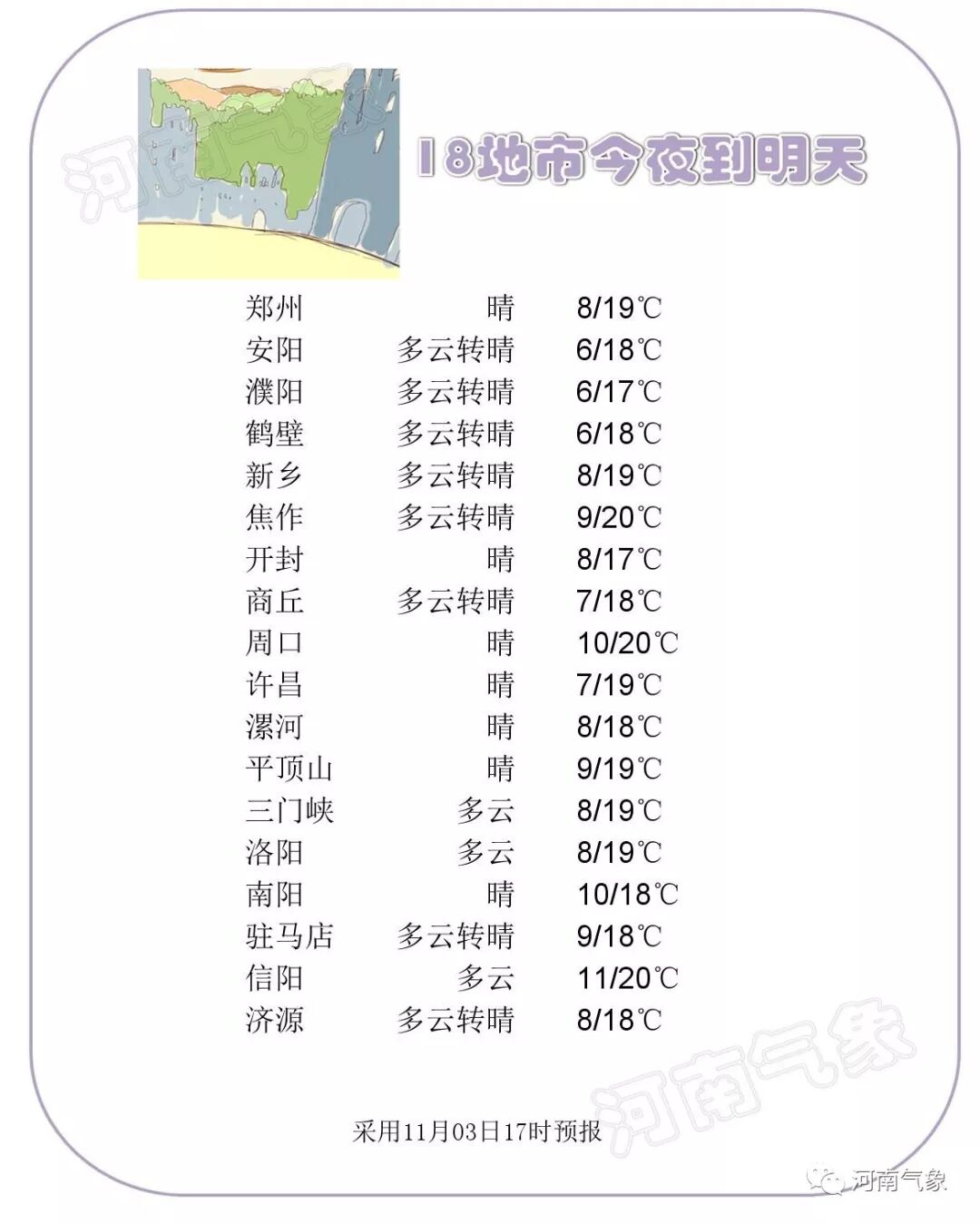 最低温度:西部山区、北部5到7度;其它地区8到10度。最高温度:西部15到17度;其它地区18到20度。