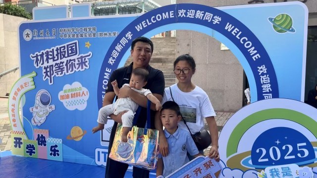 9月7号上午,在郑州大学主校区随处可见精心设计的迎新墙,不少学子在家人的陪伴下前来报到,学长学姐热情地帮新生搬运行李、指引路线。科学材料与工程学院2025级博士生李乔带着5岁儿子和9个月的姑娘重回母校,心情格外激动。他说:“2009年的秋天,我爸妈送我来到这个地方。这一次,我带着我的孩子父母过来,有个仪式感,圆了一个小小的梦想,也给孩子树立这样一个榜样意识,让他们在求学的路上一如既往,一直上进。”